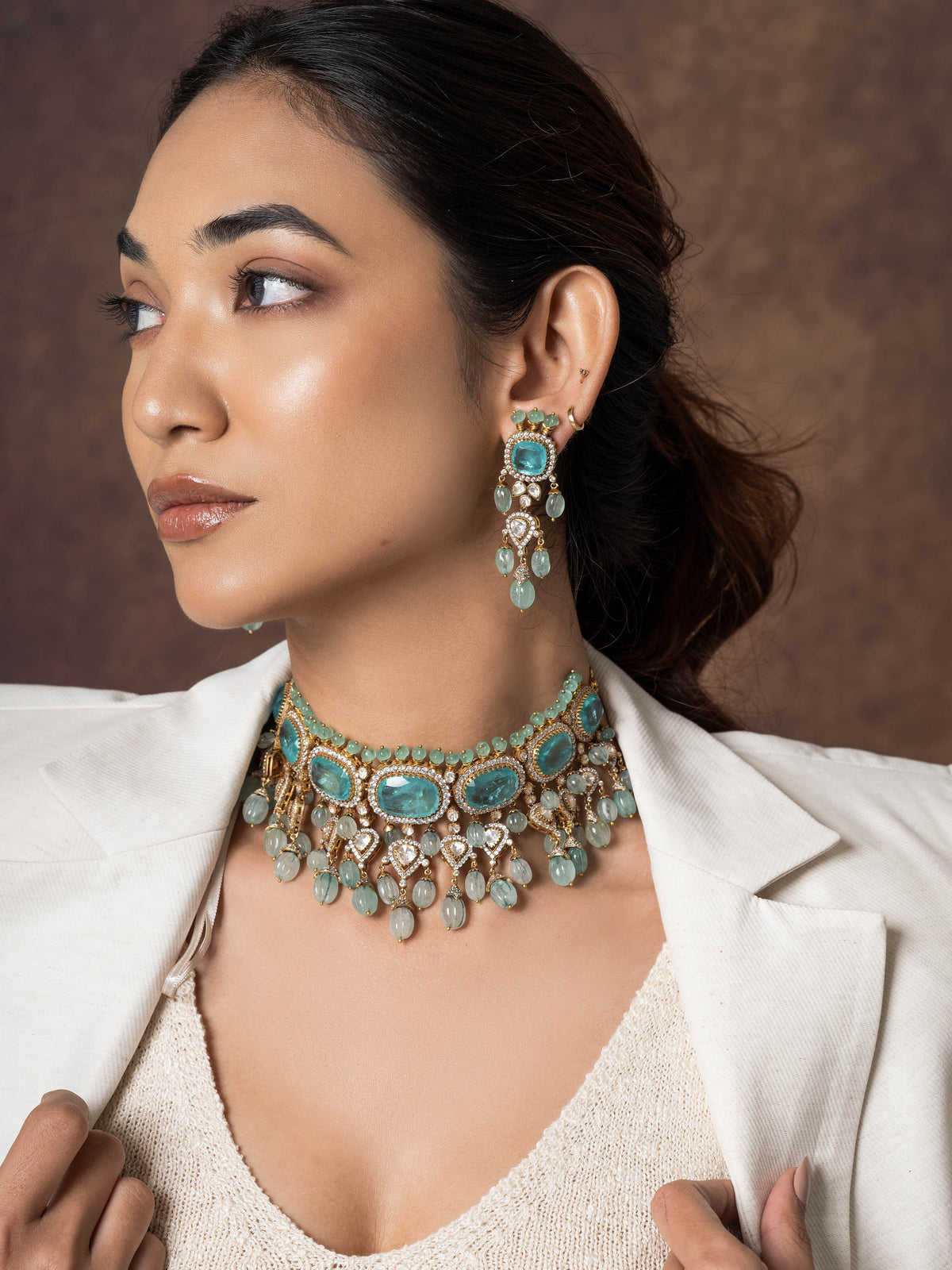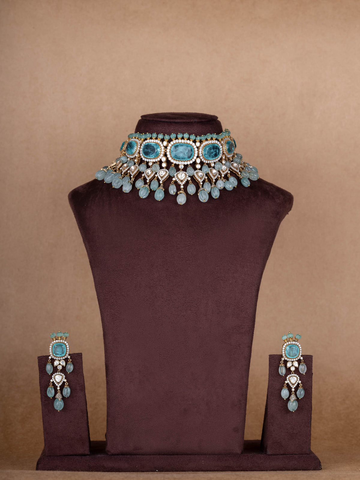 Glamoriously Glittring Aquamarine Inlaid Polki Choker Set