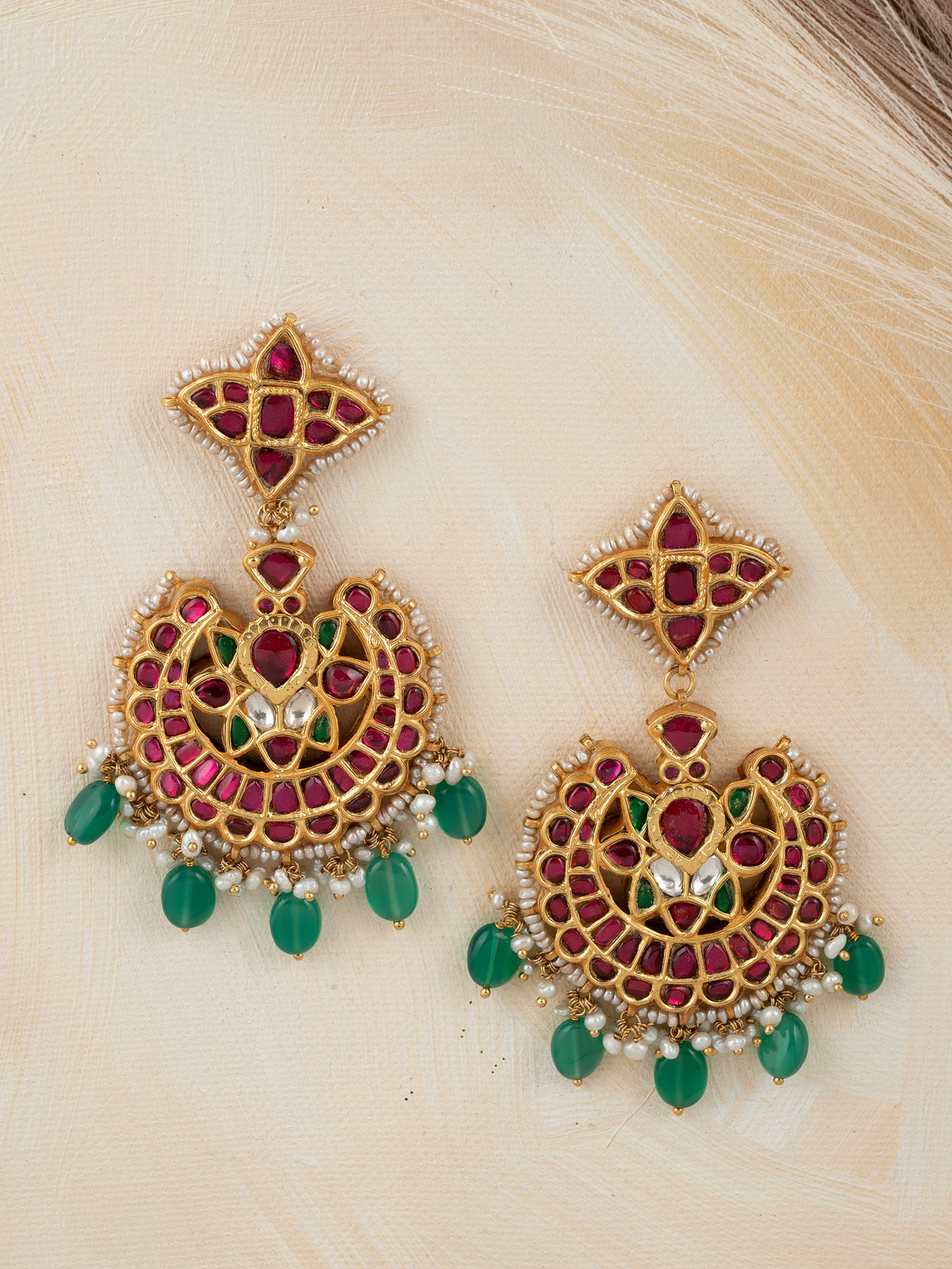 Inspired by the brilliance of the night sky, Reva is a celebration of radiance and regal charm. These Jadau Kundan Chandbalis, handcrafted in pure 92.5 silver and finished in rich gold plating, reflect the timeless beauty of Indian craftsmanship.