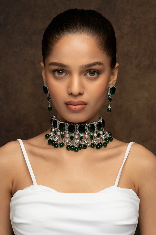 Drape Yourself in Studio Gulabi’s Green Stone & White Diamond Gold-Plated Necklace Set