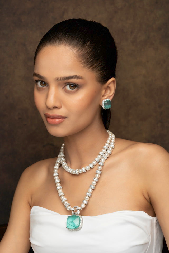 Step into refined sophistication with Studio Gulabi’s Sravya Two-Layered Pendant Set—a delicate balance of tradition and contemporary allure. Adorned with brilliant simulated diamonds and soft pink stones, this two-layered necklace exudes a radiant charm, making it a versatile statement piece for weddings, festive celebrations, and elegant soirées.