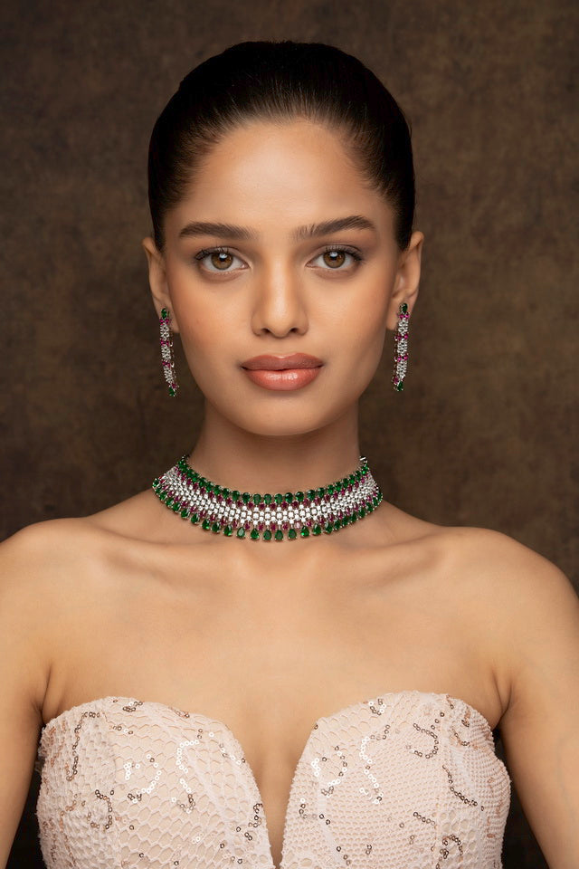 Unit price perGreen, Maroon & White Diamond Gold-Plated Necklace Set – A Regal Fusion of Colors