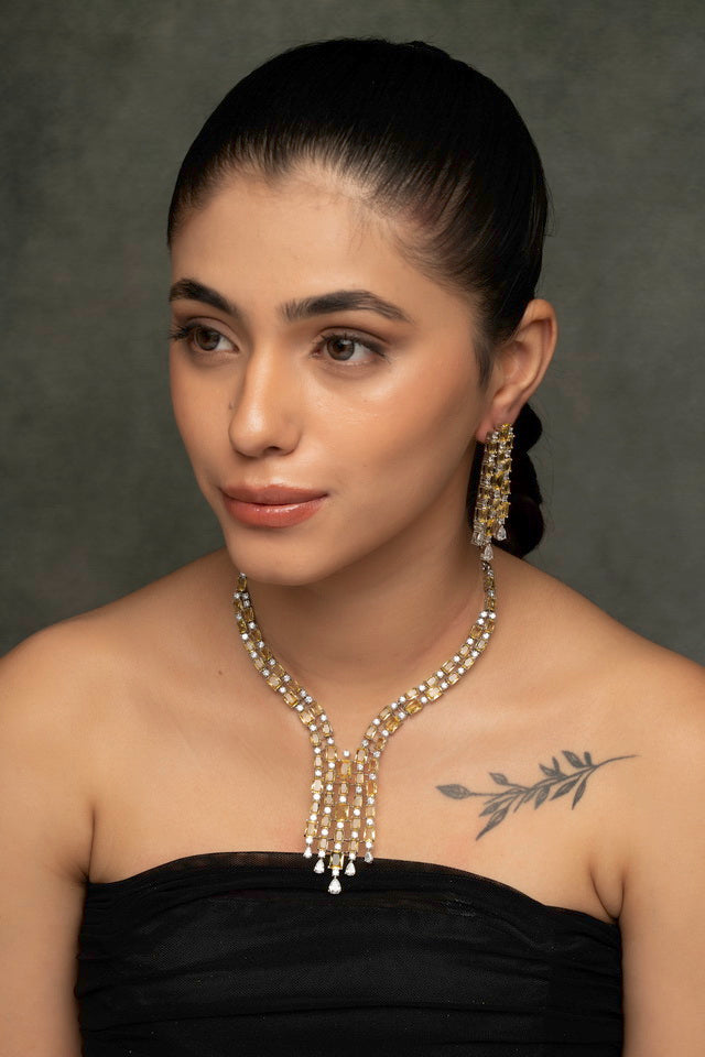 The intricate craftsmanship, combined with radiant diamonds, ensures a dazzling glow, making it the perfect companion for lavish parties, cocktail evenings, and red-carpet affairs. The necklace’s adjustable clasp guarantees a flawless fit, while the matching earrings bring effortless glamour to every look.