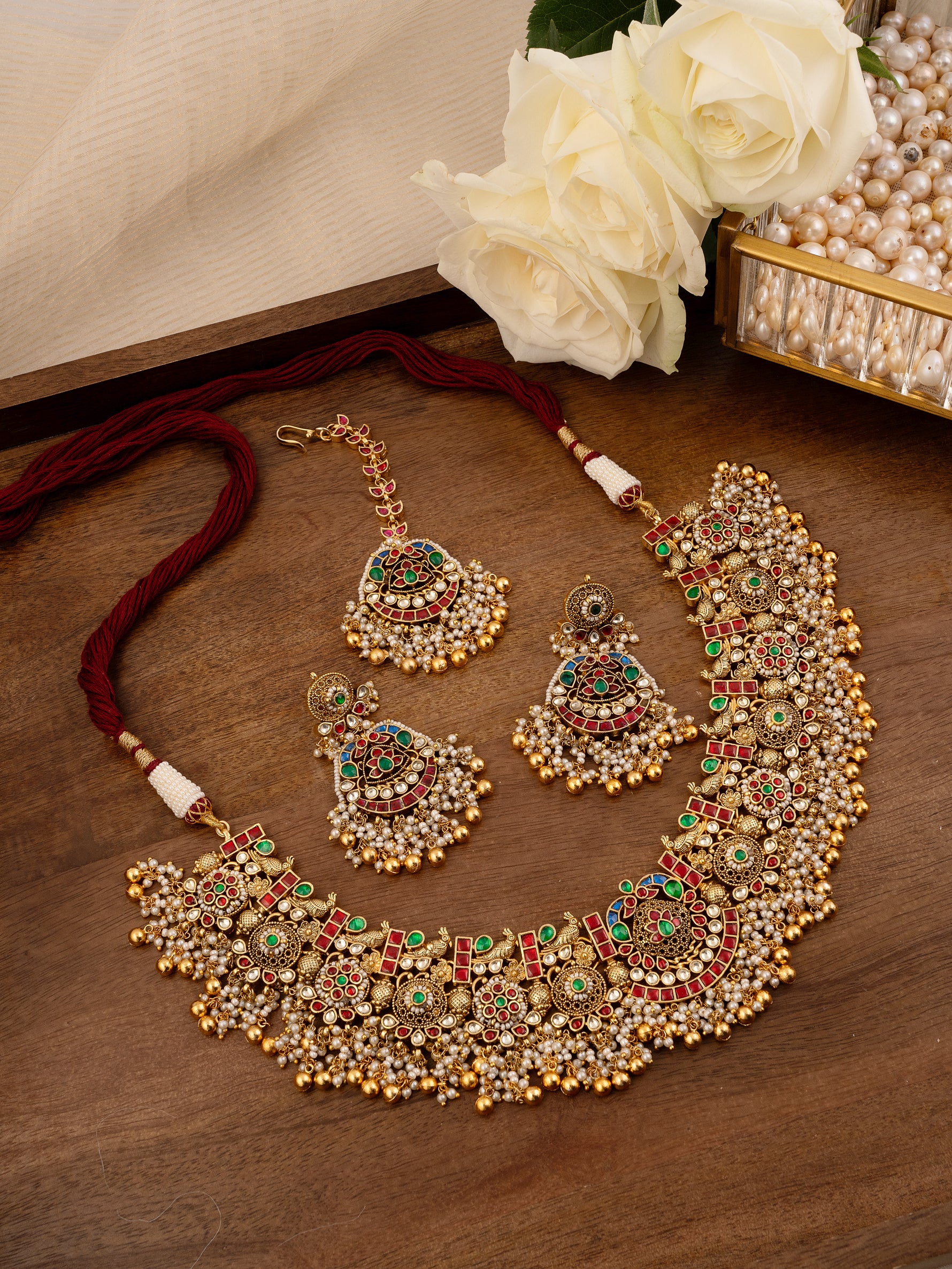 - Contains: One Necklace, One Pair of Earrings, and One Maang Tikka
