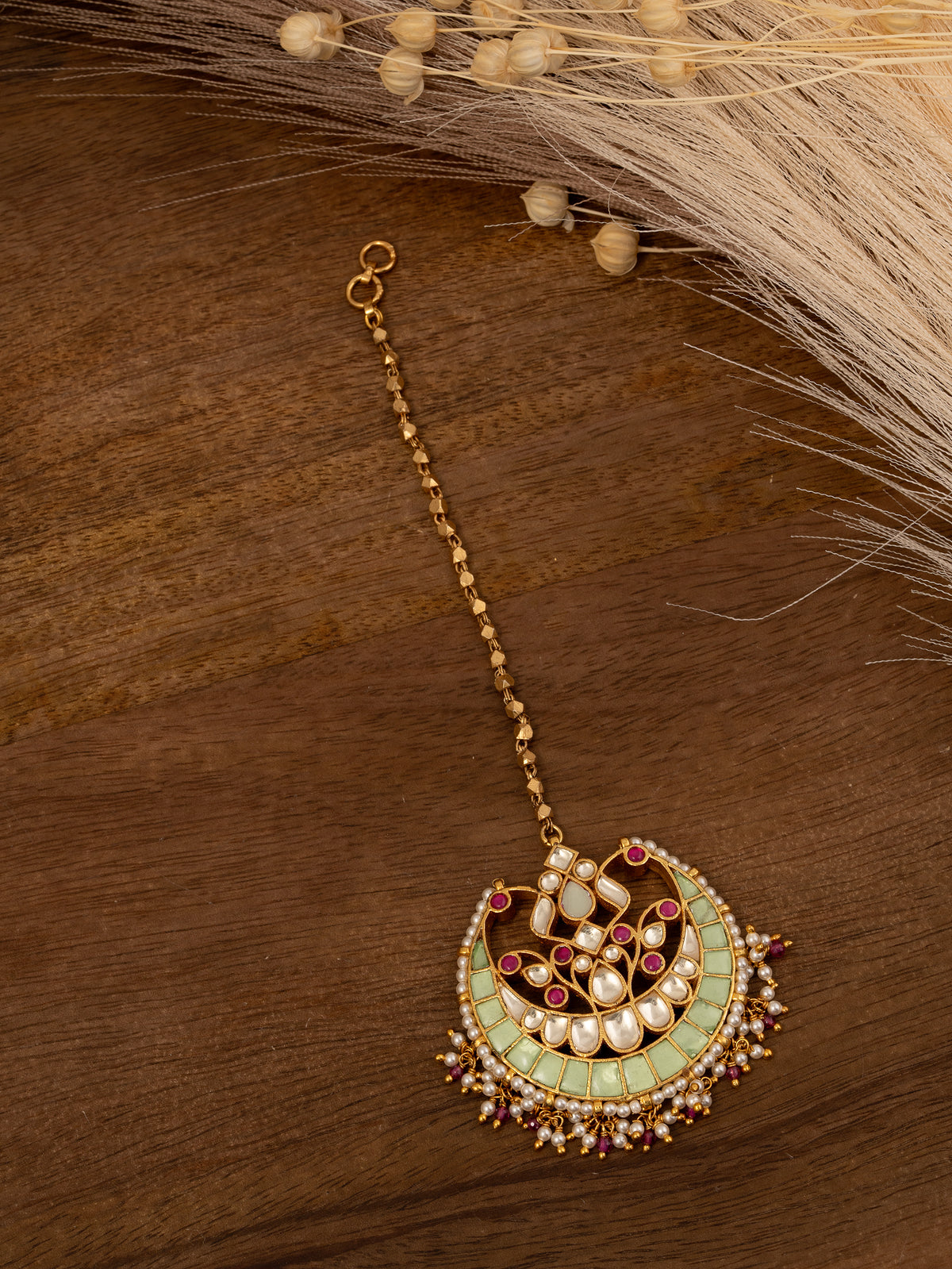 Unit price perDescription: An elegant maang tikka adorned with polki pearls and white stones.
