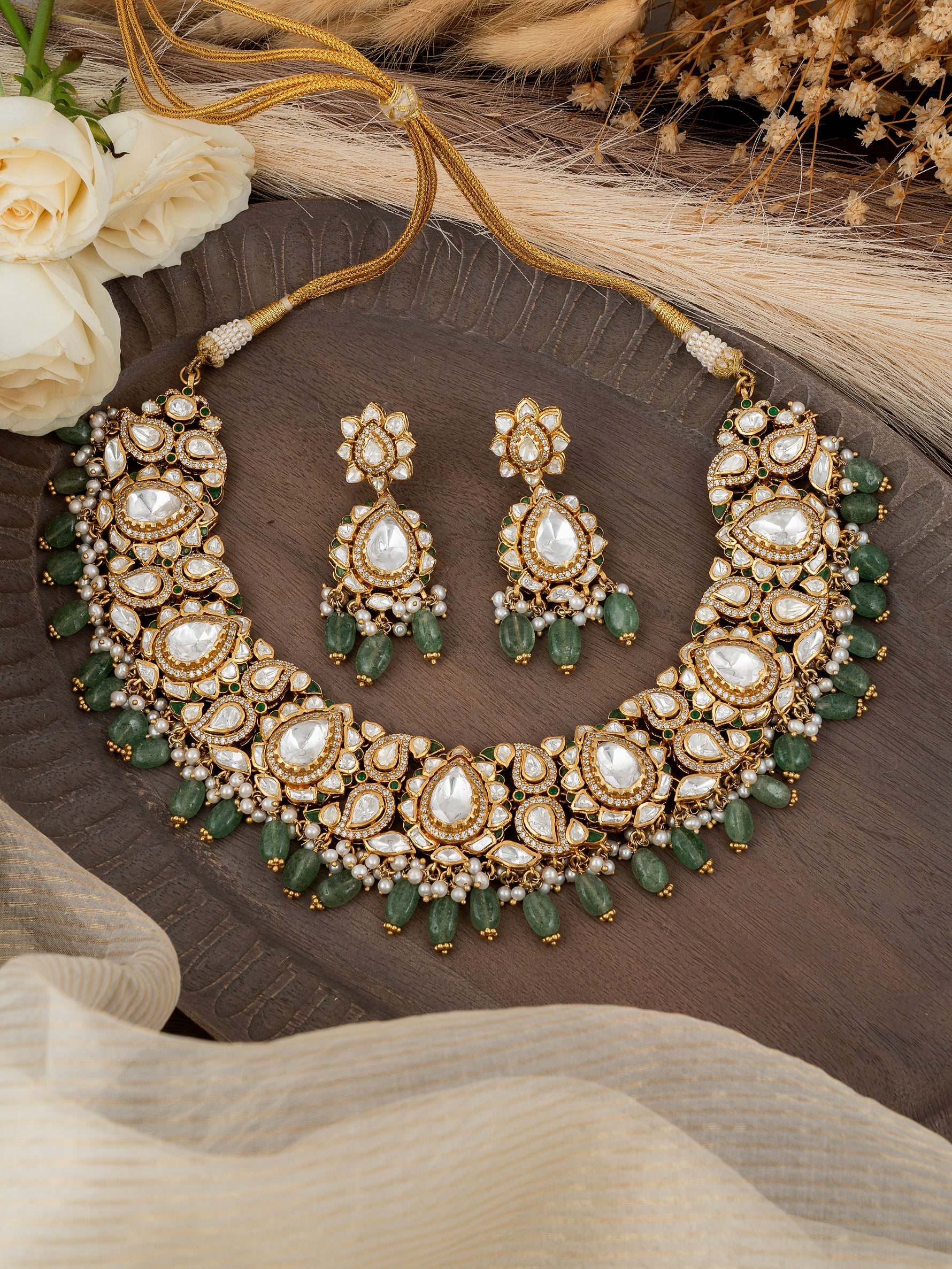Aventurine Polki & Diamond Necklace Set | 92.5 Silver with Premium Gold Plating