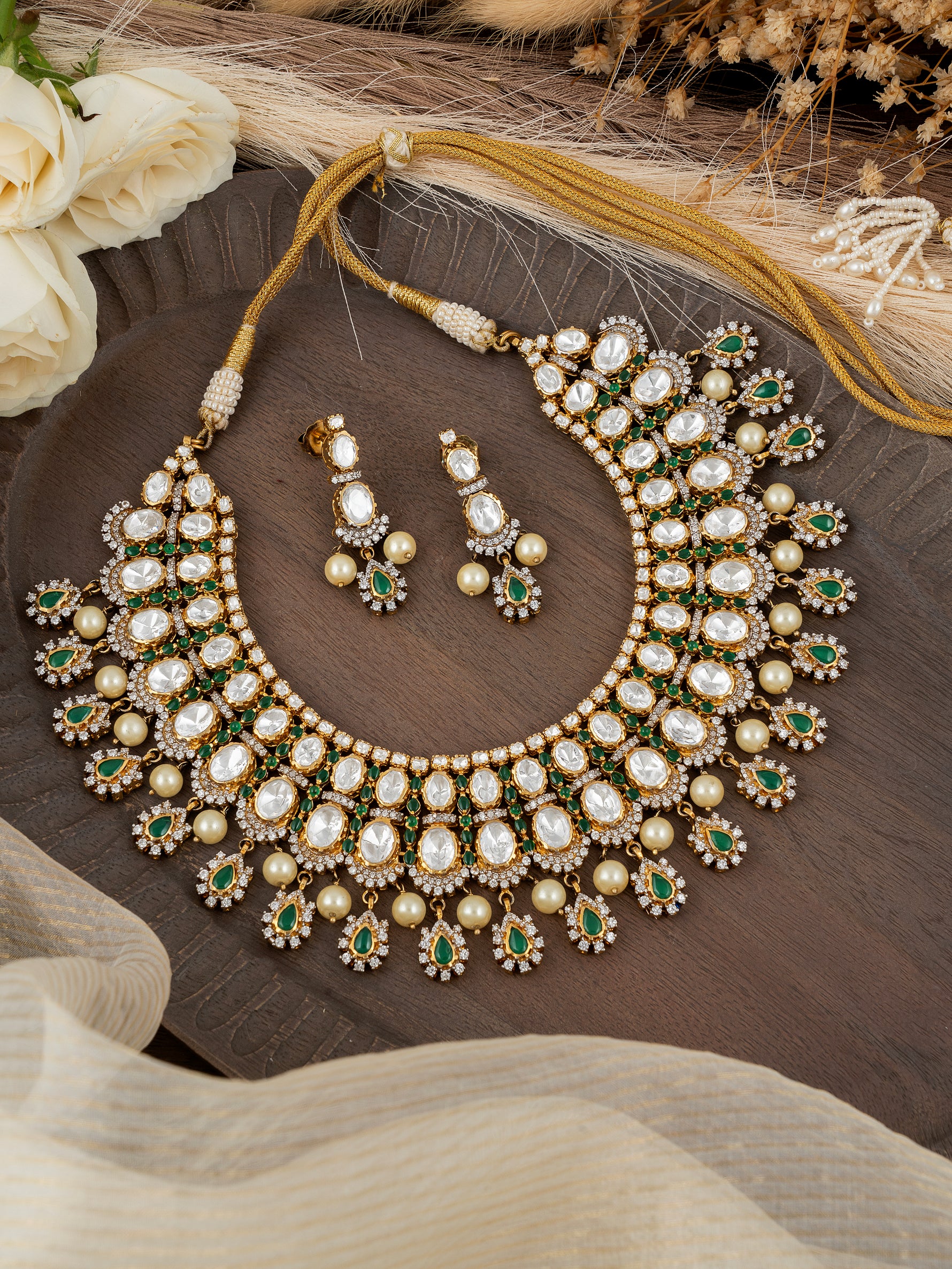 Green Onyx Polki & Diamond Necklace Set | 92.5 Silver with Premium Gold Plating