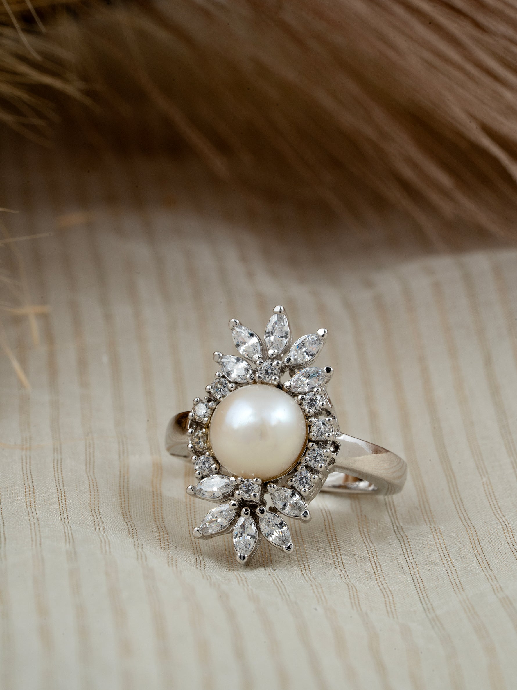92.5 Silver Adjustable Ring with Diamond & Freshwater Pearls – Gold Plated Elegance