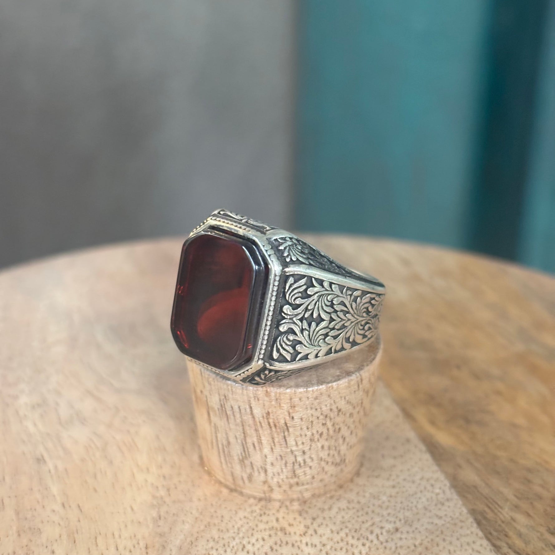 This black rhodium silver men's ring features a square motif with Brown-coloured stones and shimmering zircons.