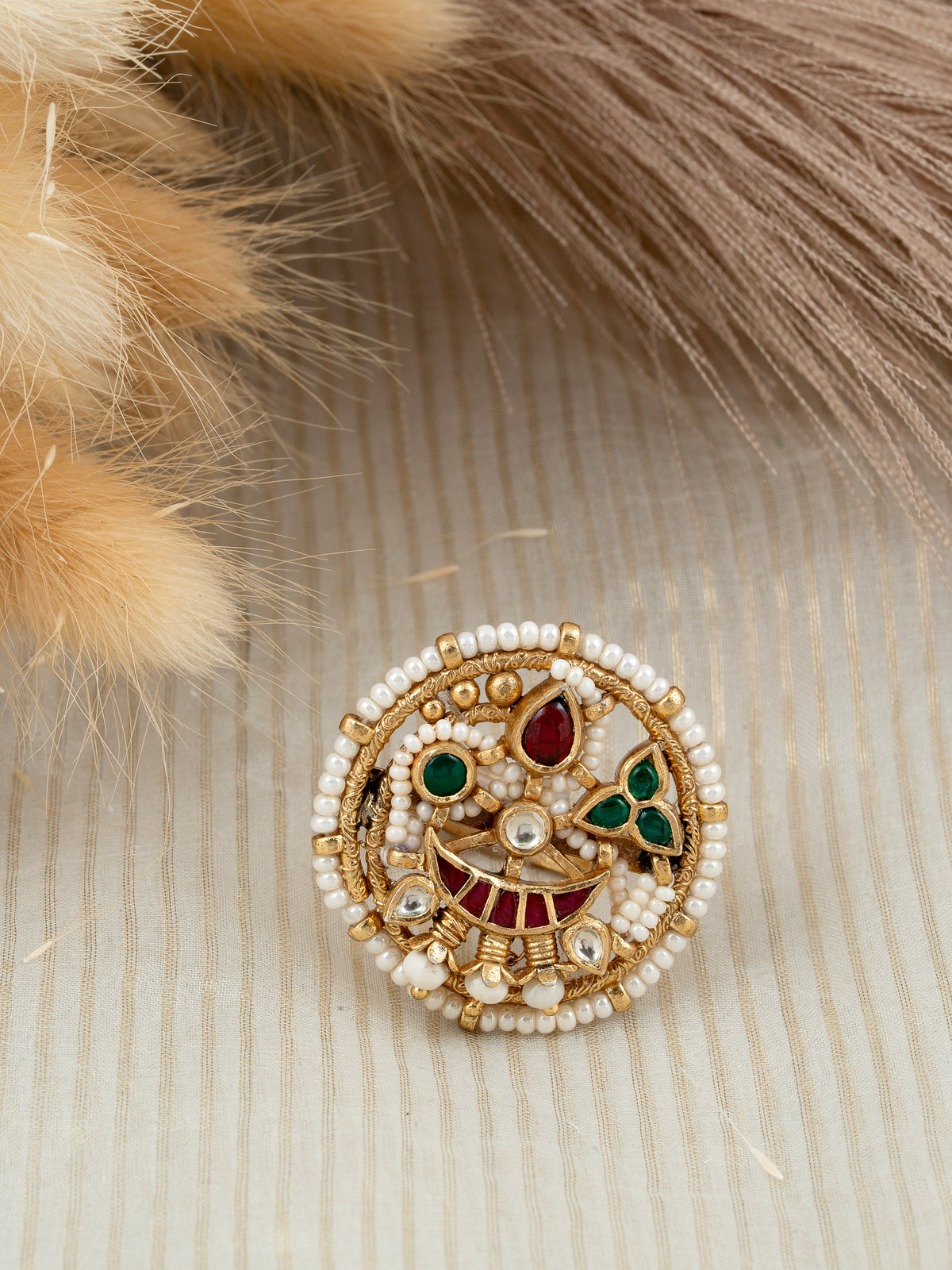 Jadau Kundan Adjustable Ring with Freshwater Pearls – 92.5 Silver Gold Plated