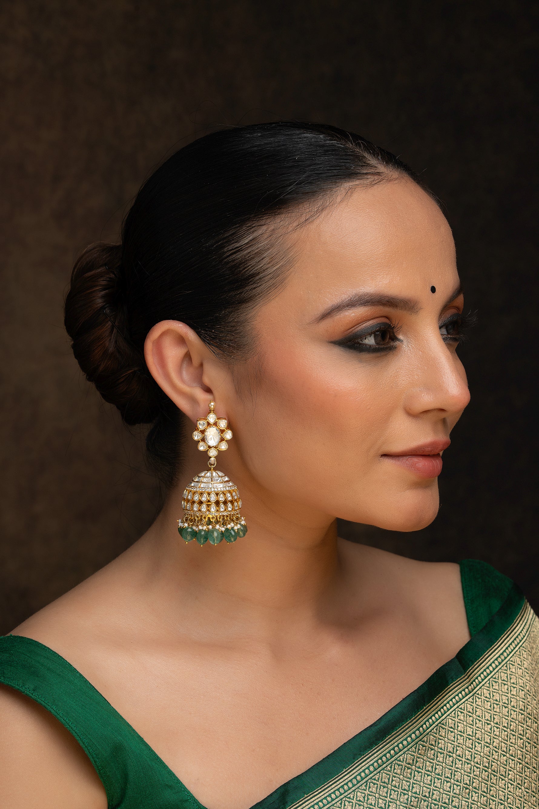 The classic bell-shaped Jhumka design, adorned with meticulously set Polki stones, adds a touch of heritage elegance. Their lightweight structure and secure fastening ensure all-day comfort, while the gold-plated finish enhances their opulent appeal.