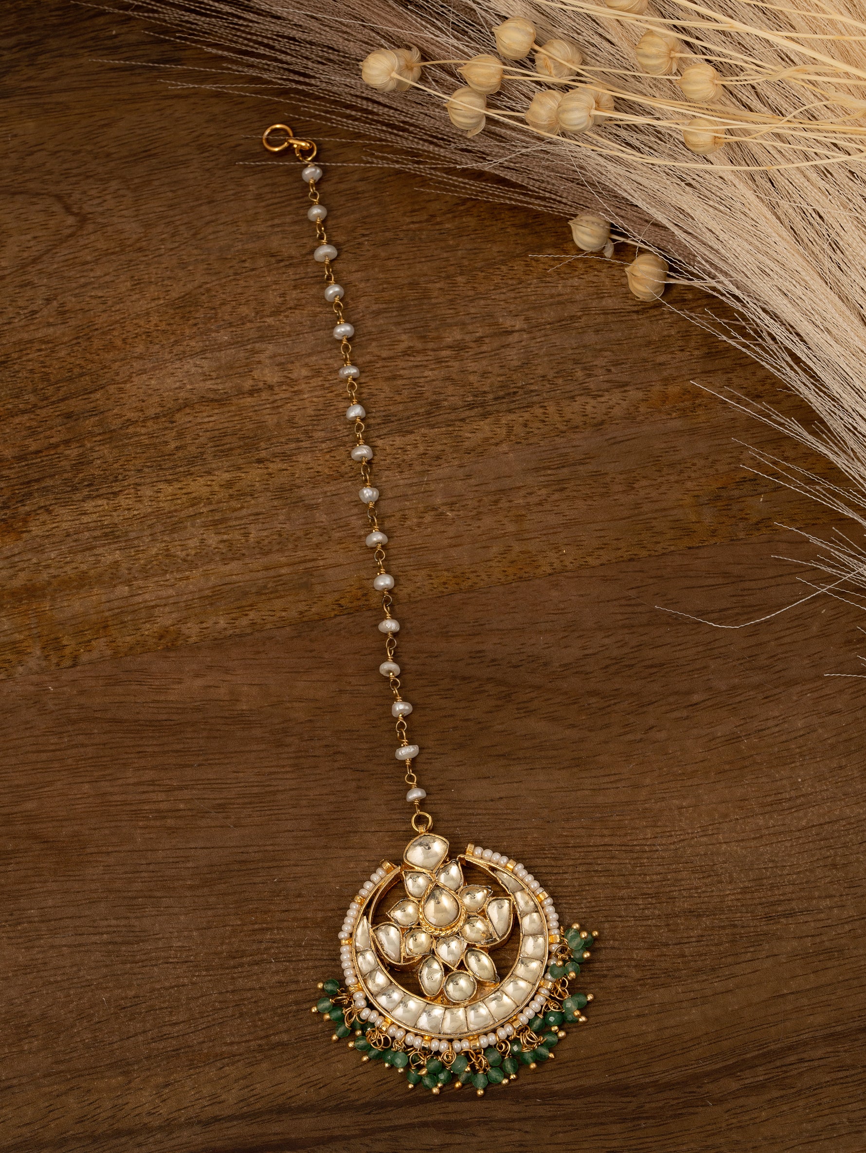 Description: An elegant maang tikka adorned with pearls and white stones.