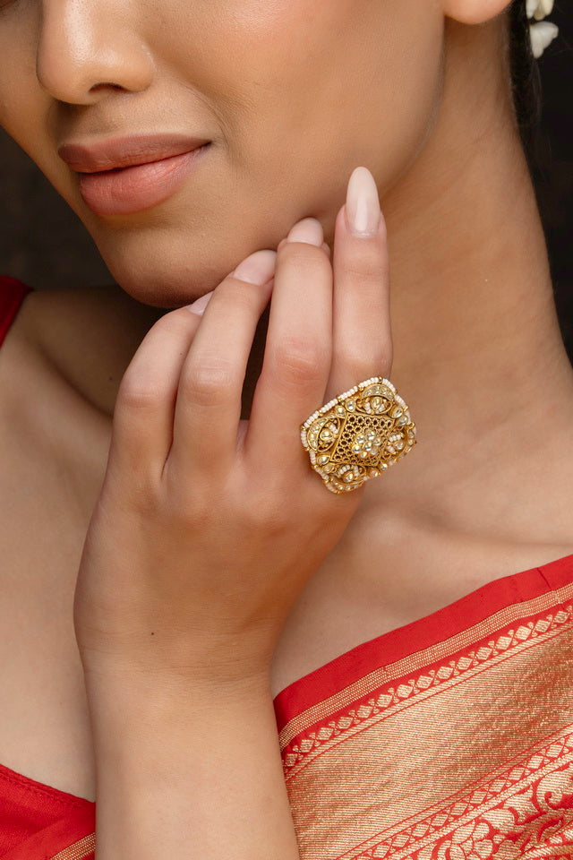 Step into the world of royal elegance with Studio Gulabi’s Samaira Jadav Kundan Ring—a breathtaking piece that effortlessly combines vintage allure with bold sophistication. Adorned with authentic Jadav Kundan work and enriched with an antique gold-plated finish, this ring is crafted to be a captivating focal point, adding timeless grandeur to your look.