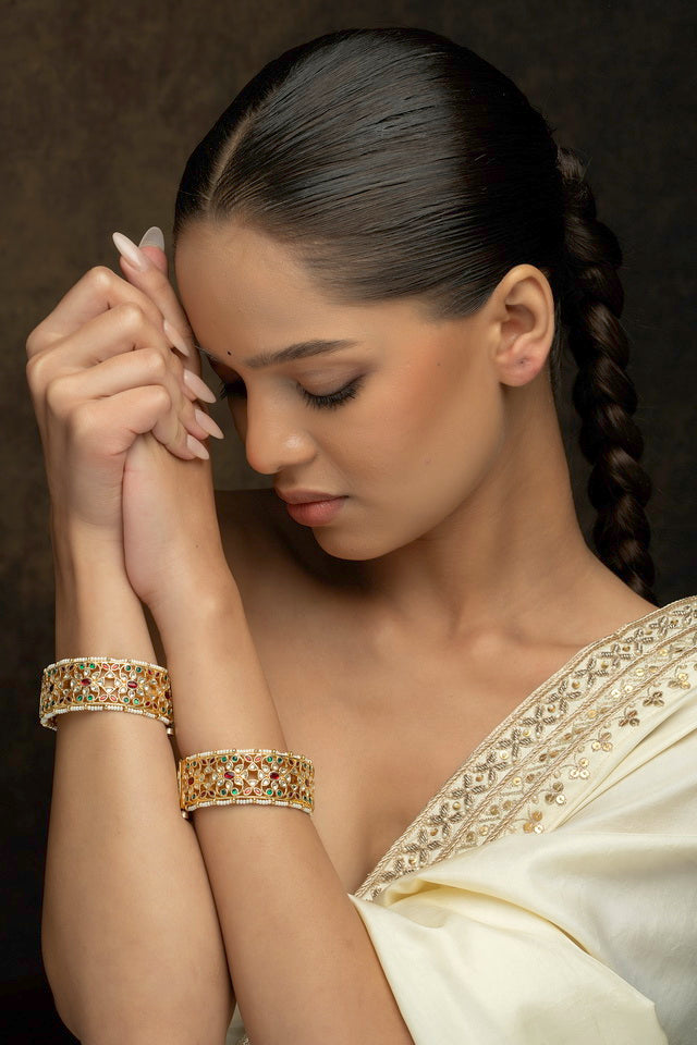 Studio Gulabi’s Reva Collection is a tribute to the rich legacy of Polki jewelry, blending traditional artistry with modern finesse. Designed to evoke the grandeur of royal jewels, this collection features an exquisite fusion of Moissanites, Kundan, and Zircons, capturing the brilliance of heirloom treasures in a refined and wearable form.