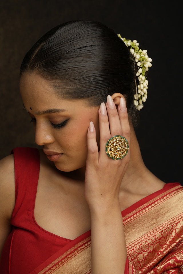 Celebrate the beauty of tradition with Studio Gulabi’s Meher Jadau Kundan Ring—a mesmerizing masterpiece that blends vintage charm with royal allure. Embellished with authentic green Jadau Kundan work and enriched with an antique gold-plated finish, this ring embodies timeless elegance while adding a regal touch to your attire.