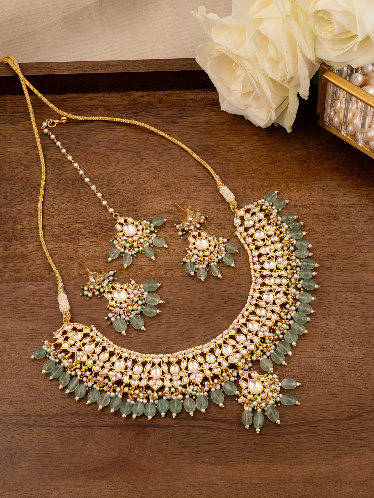 - Contains: One Necklace and One Pair of Earrings and One Mang Tika